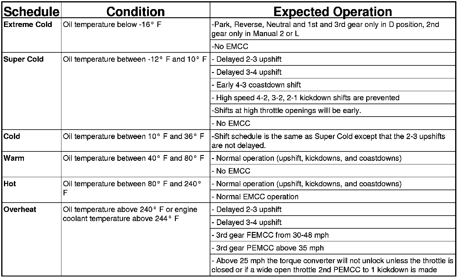 As driving conditions change, the TCM appropriately adjusts the shift schedule. Refer to the following chart to determine the appropriate operation expected, depending on driving conditions.