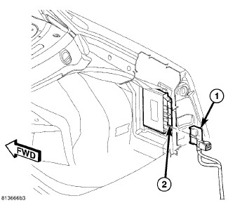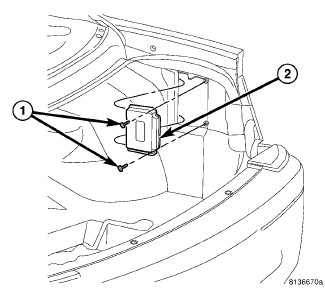 2. Position the Park Assist Module (2) and install the two attaching screws (1). Torque screws to 3.5 Nm (30 in. lbs.).