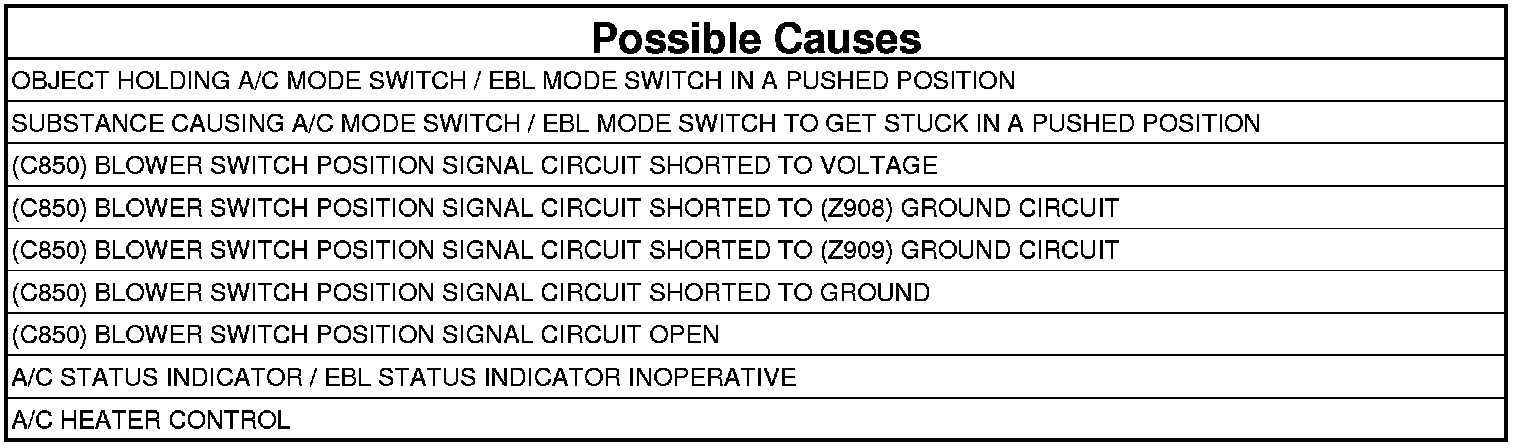 1. Inspect the A/C Heater Control for anything that would cause the A/C mode switch or the EBL mode switch to stay or stick in a pushed position.