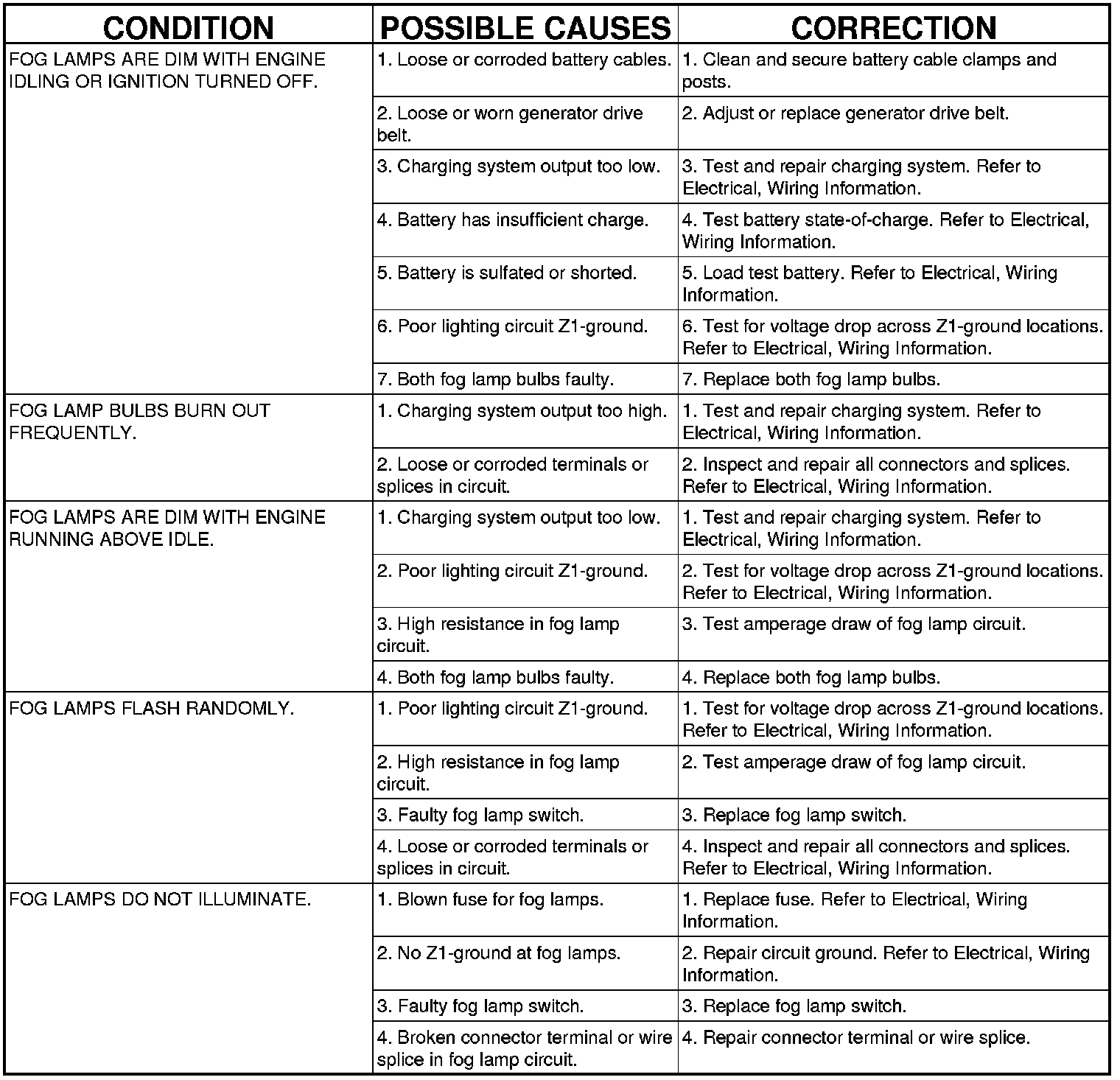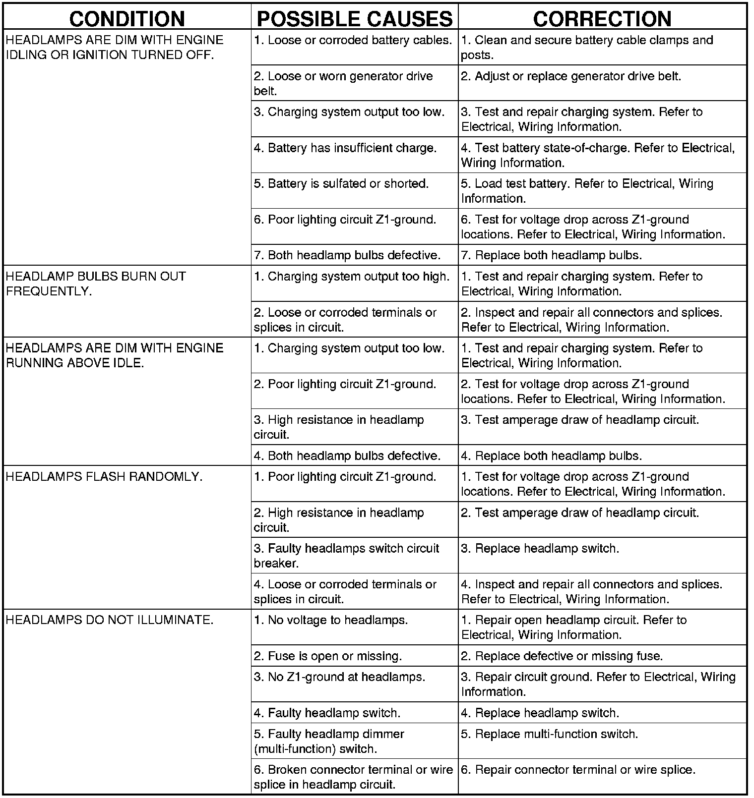 When a vehicle experiences problems with the headlamp system, verify the condition of the battery connections, fuses, charging system, headlamp bulbs, wire connectors, relay, high beam switch, dimmer switch, and headlamp switch. Refer to the appropriate wiring information. The wiring information includes wiring diagrams, procedures for proper wire and connector repair, details of wire harness routing and retention, connector pin-out information and location views for the various wire harness connectors, splices, and grounds.