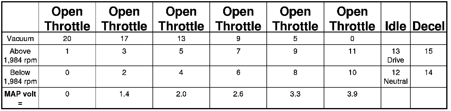 The number of cells varies upon the driving conditions. Two cells are used only during idle, based upon TPS and Park/Neutral switch inputs. There may be two other cells used for deceleration, based on TPS, engine rpm, and vehicle speed. The other twelve cells represent a manifold pressure and an rpm range. Six of the cells are high rpm and the other six are low rpm. Each of these cells has a specific MAP voltage range Typical Adaptive Memory Fuel Cells.