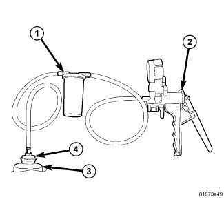 CAUTION: Failure to use a vacuum pump reservoir (1) may allow power steering fluid to be sucked into the hand vacuum pump.