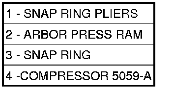 13. Using Compressor 5059-A (4) and an Arbor Press (2), compress UD clutch piston/spring enough to remove snap ring (3).
