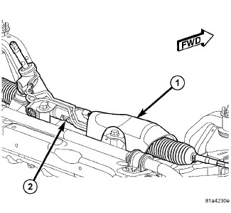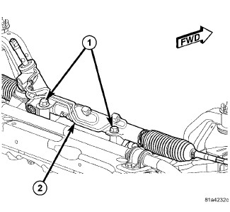 10. Install the two bolts (1) securing the steering gear (2) to the crossmember. Tighten the steering gear mounting bolts to 100 Nm (74 ft. lbs.).