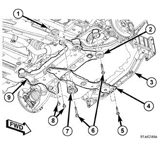3. Slowly raise the crossmember (9) into mounted position using the transmission jack matching the crossmember to the marked locations on the body made during removal. As the crossmember is raised, guide the lower ball joints into the mounting holes in the lower control arms. Also, make sure the stabilizer bar is properly positioned on the crossmember.