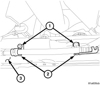 8. Position both stabilizer bar bushing retainers and install the screws (1) securing the stabilizer bushing retainers (3) to the crossmember. Tighten all four stabilizer bar cushion retainer screws to 60 Nm (44 ft. lbs.).