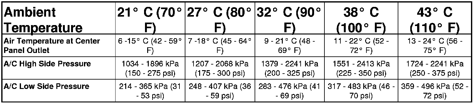 5. Compare the air temperature at the center panel outlet and the A/C system pressures to the A/C Performance Temperature and Pressure chart.