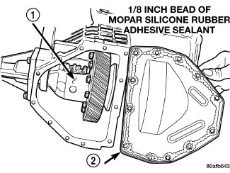 18. Install differential cover (2) with a bead of Mopar(R) Silicone Rubber Adhesive Sealant and torque bolts to 28 Nm (250 in. lbs.).