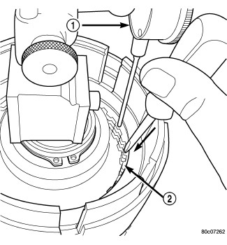 18. Install the snap ring (1) using a screwdriver (2).