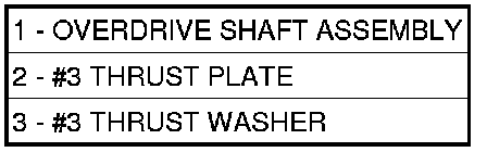 48. Install the #3 thrust plate (3) (note 3 tabs) to the bottom of the overdrive shaft assembly (1). Retain with petrolatum or transmission assembly gel (2).