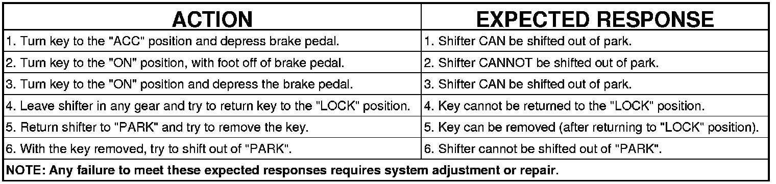 Refer to the following chart that expected shifter response, depending on ignition key/switch and brake pedal positions.