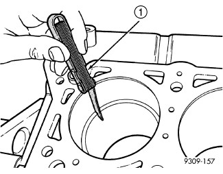 1. Wipe cylinder bore clean. Insert ring and push down with piston to ensure it is square in bore. The ring gap measurement must be made with the ring positioning at least 12 mm (0.50 in.) from bottom of cylinder bore. Check gap with feeler gauge (1). For clearance specifications, Engine Specifications.