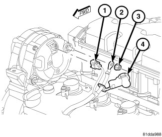 4. Remove B+ terminal mounting nut (3) and B+ terminal (2) at top of generator.
