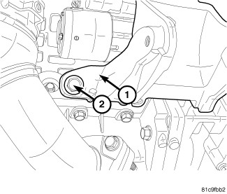 6. Install bolt (2) to transmission bracket (1). Hand tighten bolt.