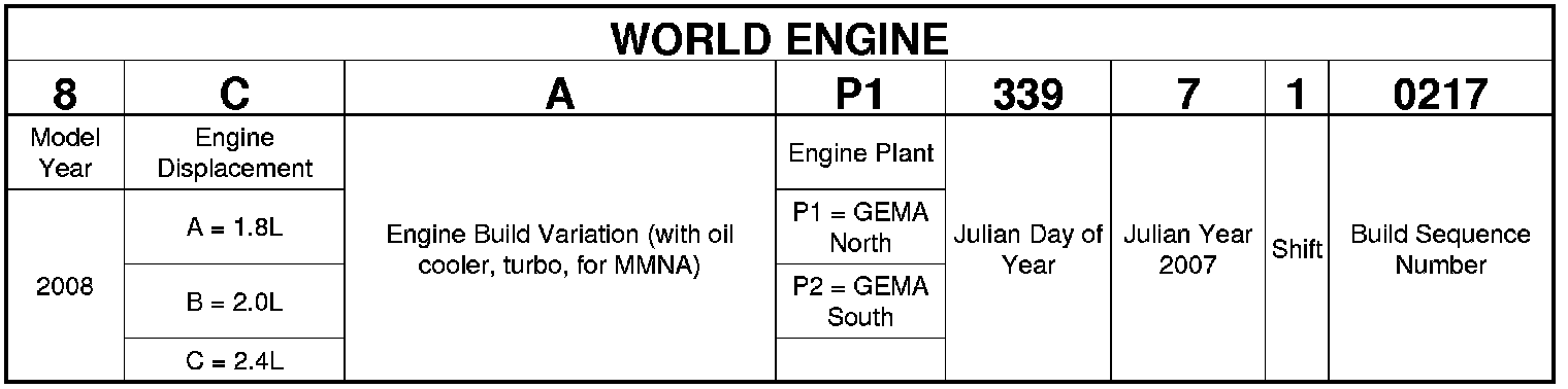 and the bellhousing. The serial number contains engine build date, build location, and displacement.