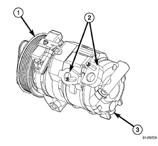 2.0L and 3.6L models are equipped with the Denso 10SR18 A/C compressor (1). This A/C compressor is a fixed displacement, five double-acting piston, reciprocating swash plate-type compressor with a displacement of 180 cubic centimeters (10.9 cubic inches). The A/C compressor is clutch operated, with the suction and discharge ports (2) and integral high pressure relief valve (3) located near the rear of the compressor. The A/C compressor is secured to the engine with three bolts.