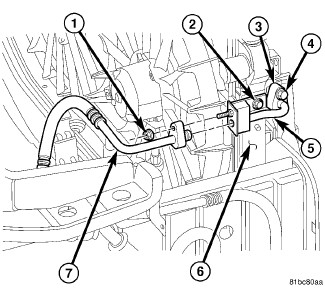 15. Connect the A/C discharge line (7) to the jumper line and install the retaining nut (1). Tighten the nut to 18 Nm (13 ft. lbs.).