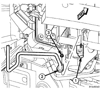 13. Install the bolt (2) that secures the jumper line to the radiator. Tighten the bolt securely.