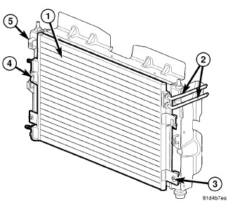 1. Carefully lower the A/C condenser (1) straight down in front of the radiator (5) and engage the upper condenser brackets (4) to the radiator.