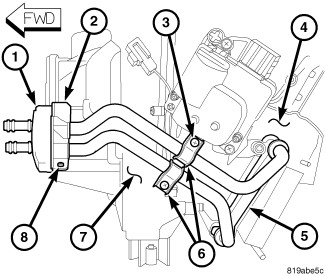 3. Install the heater core tube brackets (6) and retaining screws (3). Tighten the screws to 1.2 Nm (10 in. lbs.)
