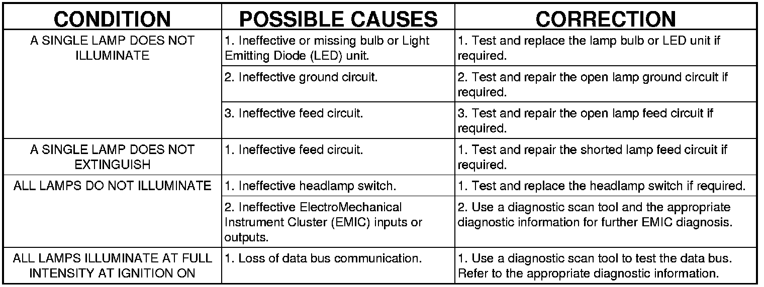 NOTE: As part of the exterior lighting failsafe feature, upon ignition ON all of the panel lamps dimmer circuit lamps will illuminate at full intensity and the exterior park lamps and headlamp low beams will illuminate regardless of the headlamp switch position if the instrument cluster cannot detect an input from the headlamp switch, or if there is a loss of data bus communication.
