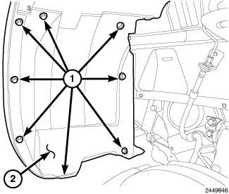 4. Install the left front wheelhouse splash shield (2) and push pins (1) Splash Shield - Installation.