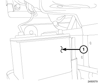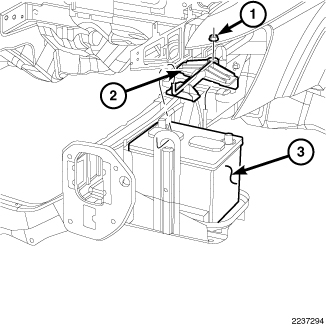 3. Position back the battery hold down bracket (3) and install the bracket nut (1).Tighten the pinch clamp nut to 55 Nm (40 ft. lbs.)