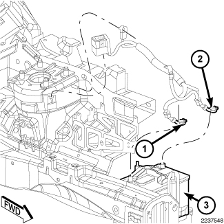 CAUTION: The negative battery cable remote terminal (2) must be disconnected and isolated from the remote battery post (1) prior to service of the vehicle electrical systems. The negative battery cable remote terminal can be isolated by using the supplied isolation hole (3) in the terminal casing.