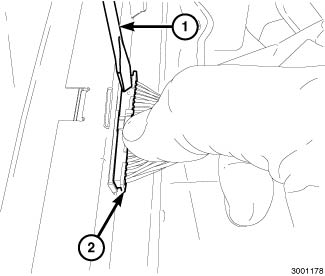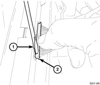 7. Using a pocket screw driver or a trim stick C-4755 or equivalent (1), gently pry on the other side of the connector (2).