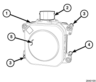 The adaptive speed control sensor (1) (also known as the Adaptive Cruise Control/ACC sensor or module, or the radar sensor or module) is located on a bracket secured near the right frame rail below the front bumper support member of the Front End Module (FEM) behind the front fascia. The stamped steel ACC sensor mounting bracket is secured by two screws to rivet nuts installed in the face of the bumper support member. This sensor is also the primary component of the Forward Collision Warning (FCW) feature of the Electronic Vehicle Information Center (EVIC).
