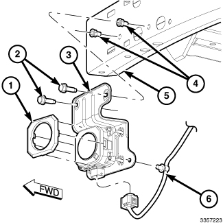 2. Remove the two screws (2) that secure the bracket to the front bumper support bar (5).