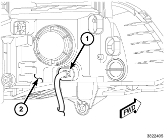 1. Position the front lamp unit (2) close enough to the front of the vehicle to reconnect the Front End Module (FEM) wire harness connections (1) to the back of the lamp housing.