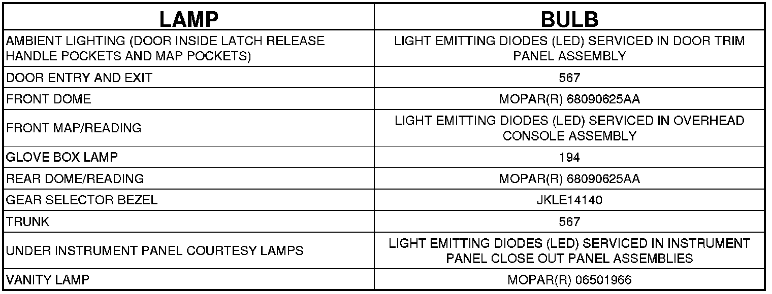 NOTE: All illuminated controls on the instrument panel and elsewhere in the interior of the vehicle have either miniature incandescent bulbs or Light-Emitting Diode (LED) units that are soldered to internal circuit boards and are not serviceable.