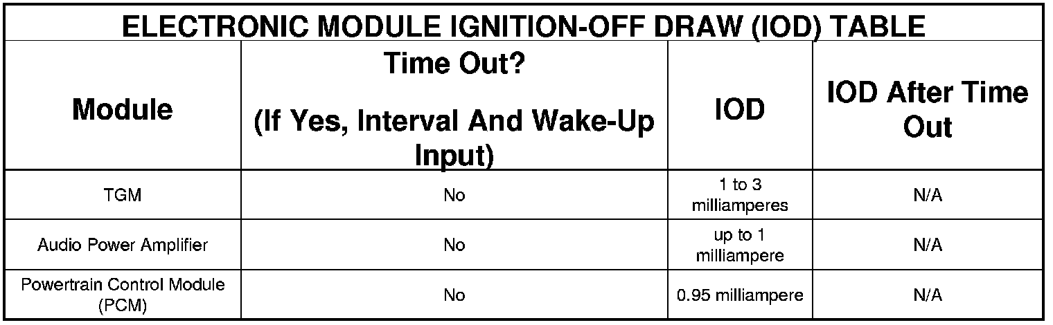 The term Ignition-Off Draw (IOD) identifies a normal condition where power is being drained from the battery with the ignition in the OFF position. A normal vehicle electrical system will draw from five to thirty-five milliamperes (0.005 to 0.035 ampere) with the ignition in the OFF position, and all non-ignition controlled circuits in proper working order. Up to thirty-five milliamperes are needed to enable the memory functions for the Powertrain Control Module (PCM), digital clock, electronically tuned radio, and other modules which may vary with the vehicle equipment.