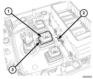 1. Align the tabs on each sunshade seat switch (1) with the openings in the floor console rear trim panel (2) and install the switch, as necessary. Push the switches firmly into the trim panel until the two retaining tabs (3) are fully engaged.