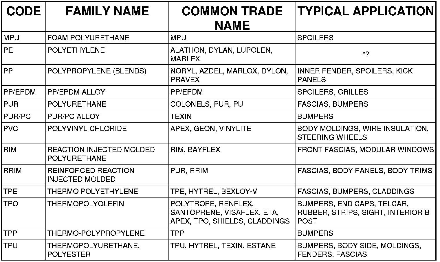 Examples of rigid plastic use: Fascias, Hoods, Doors, and other Body Panels, which include SMC, ABS, and Polycarbonates.