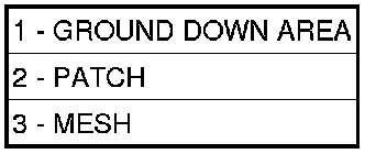 17. Using a 125 mm (5 in.) 24 grit disc grinder (3), grind a 50 mm (2 in.) to 75 mm (3 in.) wide and 75% -80% deep (original material thickness) path across the gaps (2) around the patch (1). With compressed air, blow dust from around patch.