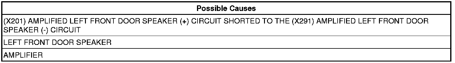 - Repair the (X201) Amplified Left Front Door Speaker (+) circuit, and the (X291) Amplified Left Front Door Speaker (-) circuit for a short together.