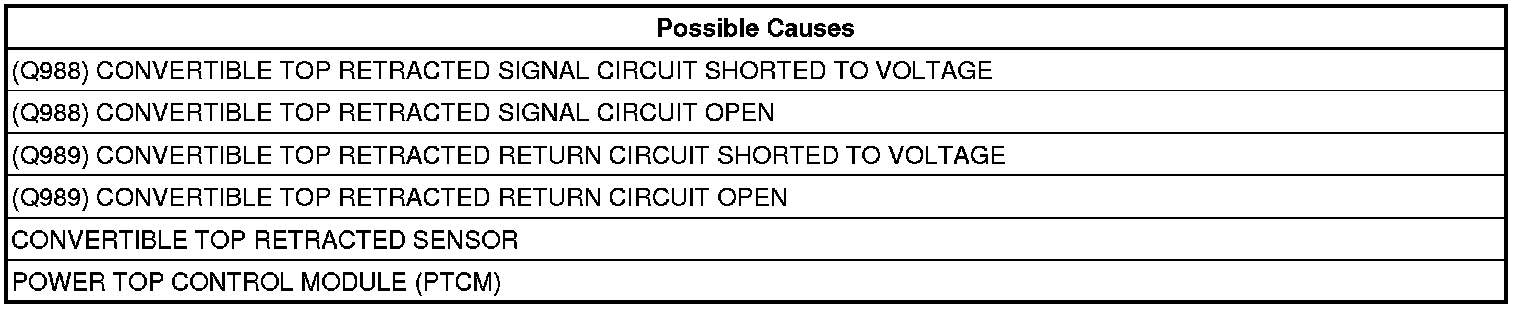 - Repair the (Q989) Convertible Top Retracted Return circuit for a short to voltage.