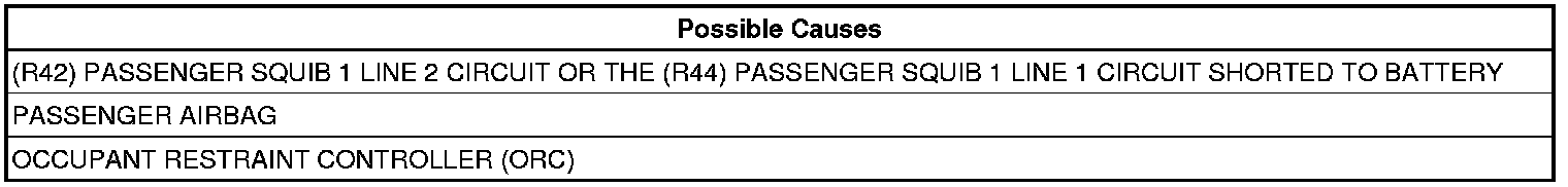 The Occupant Restraint Controller (ORC) monitors the voltage on the Passenger Squib 1 circuits. The ORC will set this DTC if it detects voltage on the Passenger Squib 1 circuits.