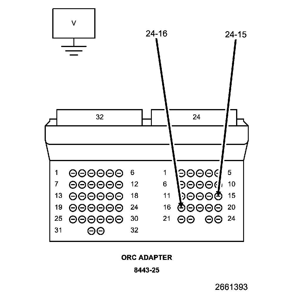 5. Measure the voltage of the (R44) Passenger Squib 1 Line 1 circuit between the SRS Load Tool Adaptor (8443-25) cavity 24-15 and ground.