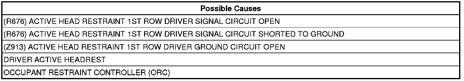 - Repair the (R676) Active Head Restraint 1st Row Driver Signal circuit for an open or high resistance.