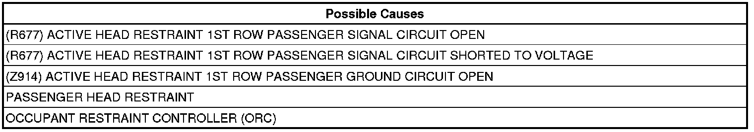 - Repair the (R677) Active Head Restraint 1st Row Passenger Signal circuit for an open or high resistance.