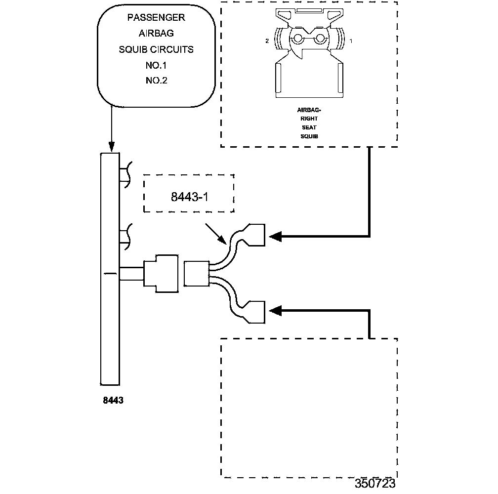 2. Connect the SRS Load Tool Kit (8443A) and SRS Load Tool Jumper (8443-1) to the Right Seat Squib Airbag connector.