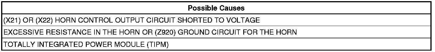 - Repair the short to voltage in the (X21) or (X22) Horn Control Output circuit.
