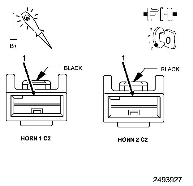 4. Using a 12-volt test light connected to 12-volts, check the (Z920) Ground circuit in the Horn 1 and 2 C2 harness connectors.