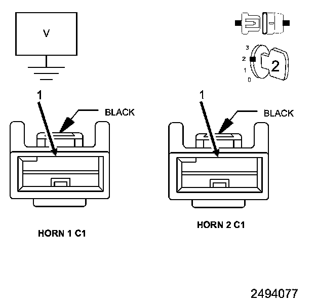 4. Measure the voltage between the (X21) and (X22) Horn Control Output circuits and ground at the Horn 1 and 2 C1 harness connectors.