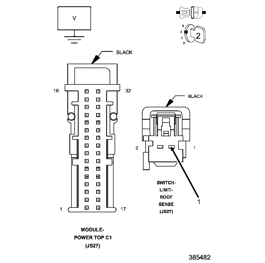 1. Measure the resistance between ground and the (Z907) Ground circuit in the Roof Sense Limit Switch harness connector.