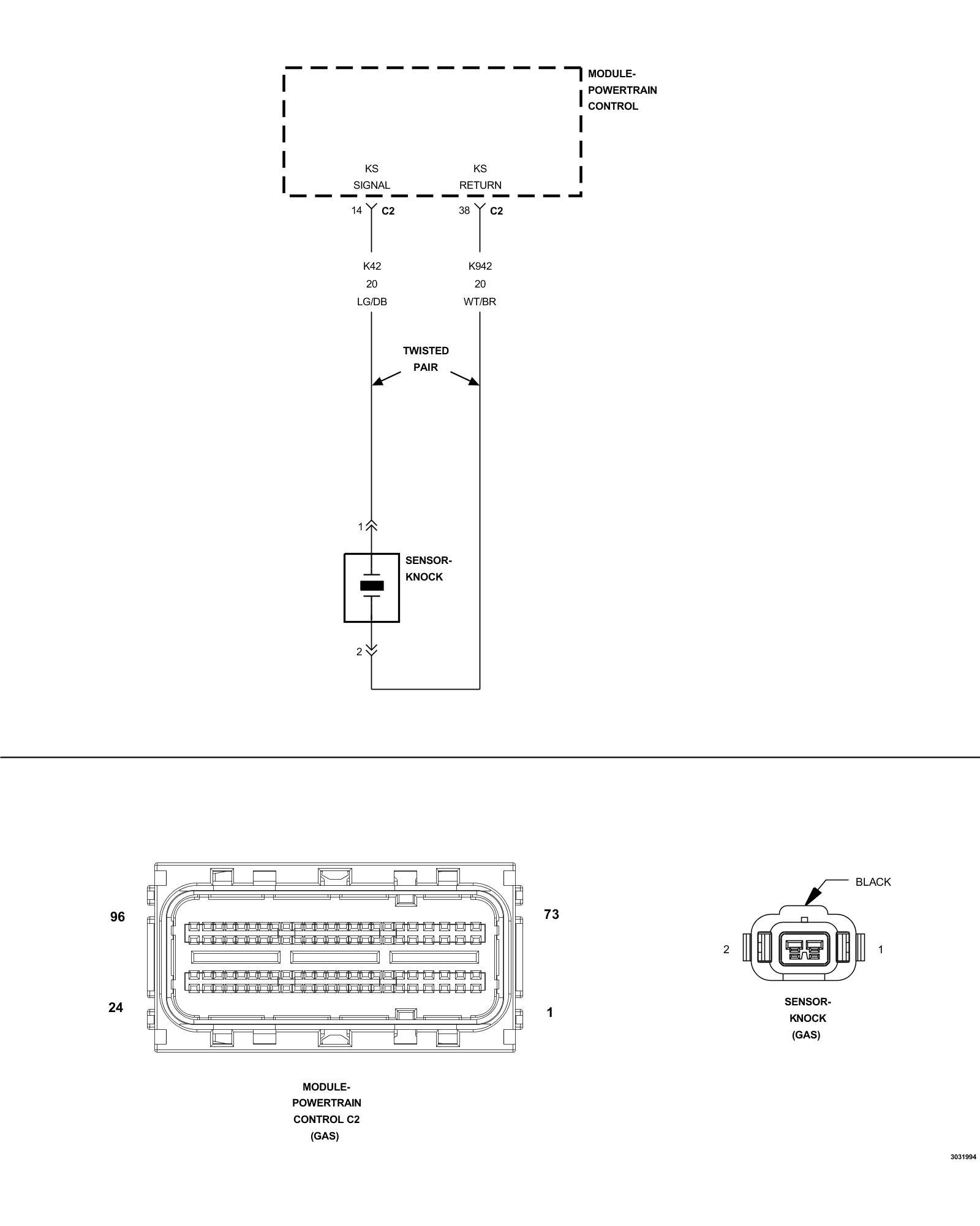 1. Using the wiring diagram/schematic as a guide, inspect the wiring and connectors between the Knock Sensor and the Powertrain Control Module (PCM).