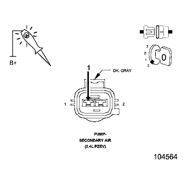 4. Using a 12-volt test light connected to ground, check the Fused Ignition Switch Output circuit in the C1 Secondary Air Pump Assembly harness connector.